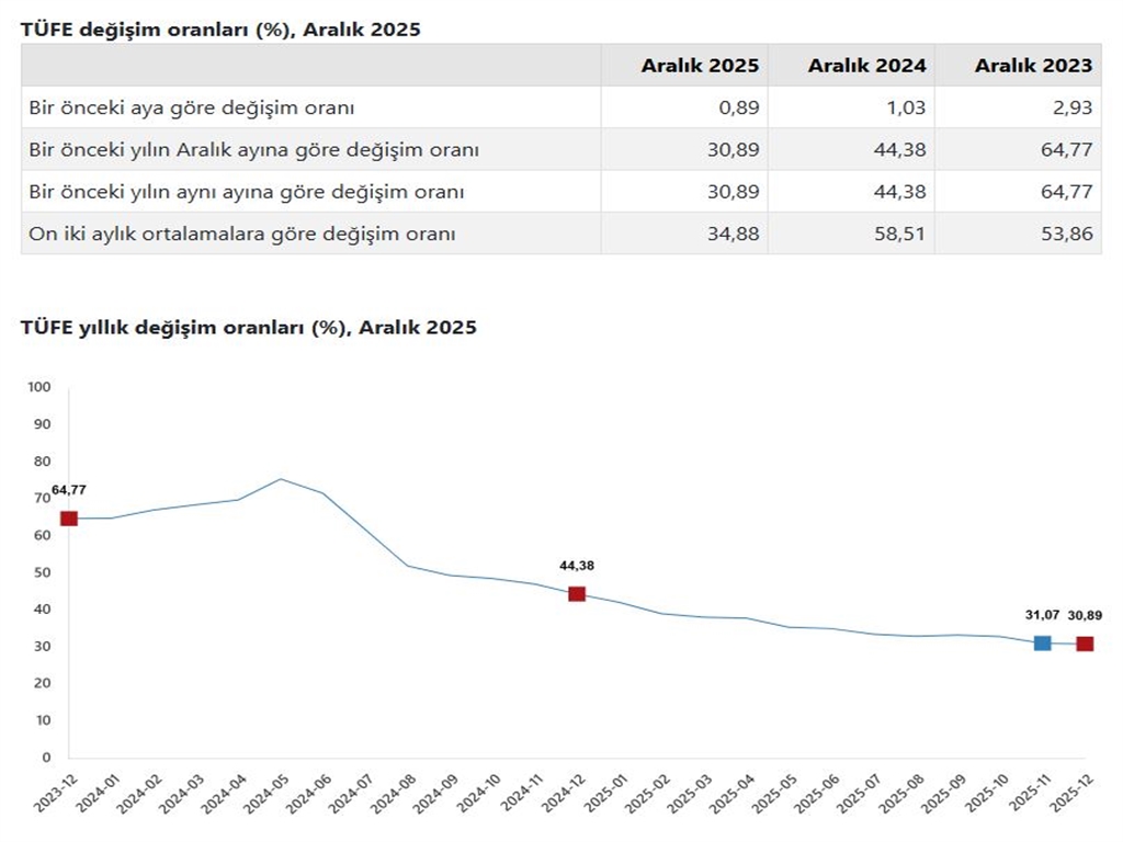 Yurt içi üretici fiyatlarına bakıldığında, aralık ayında bir önceki aya göre %0,75, bir önceki yılın aynı ayına göre %27,67 ve 12 aylık ortalamalara göre %25,36 artış gözlendi.