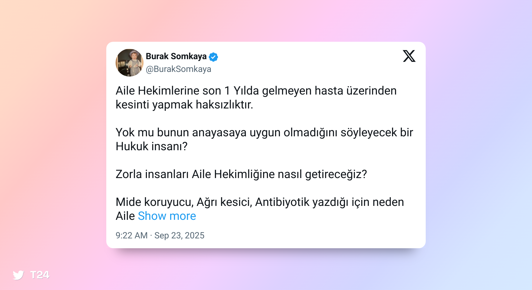 Somkaya, “Yok mu bunun anayasaya uygun olmadığını söyleyecek bir hukuk insanı? Zorla insanları aile hekimliğine nasıl getireceğiz?” ifadelerini kullandı. Aile hekimlerinin mide koruyucu, ağrı kesici ve antibiyotik yazmaları nedeniyle kesintiye uğratıldığını belirten Somkaya, “Madem bu ilaçlar çok zararlı, neden eczanelerden satışına izin veriliyor?” dedi.